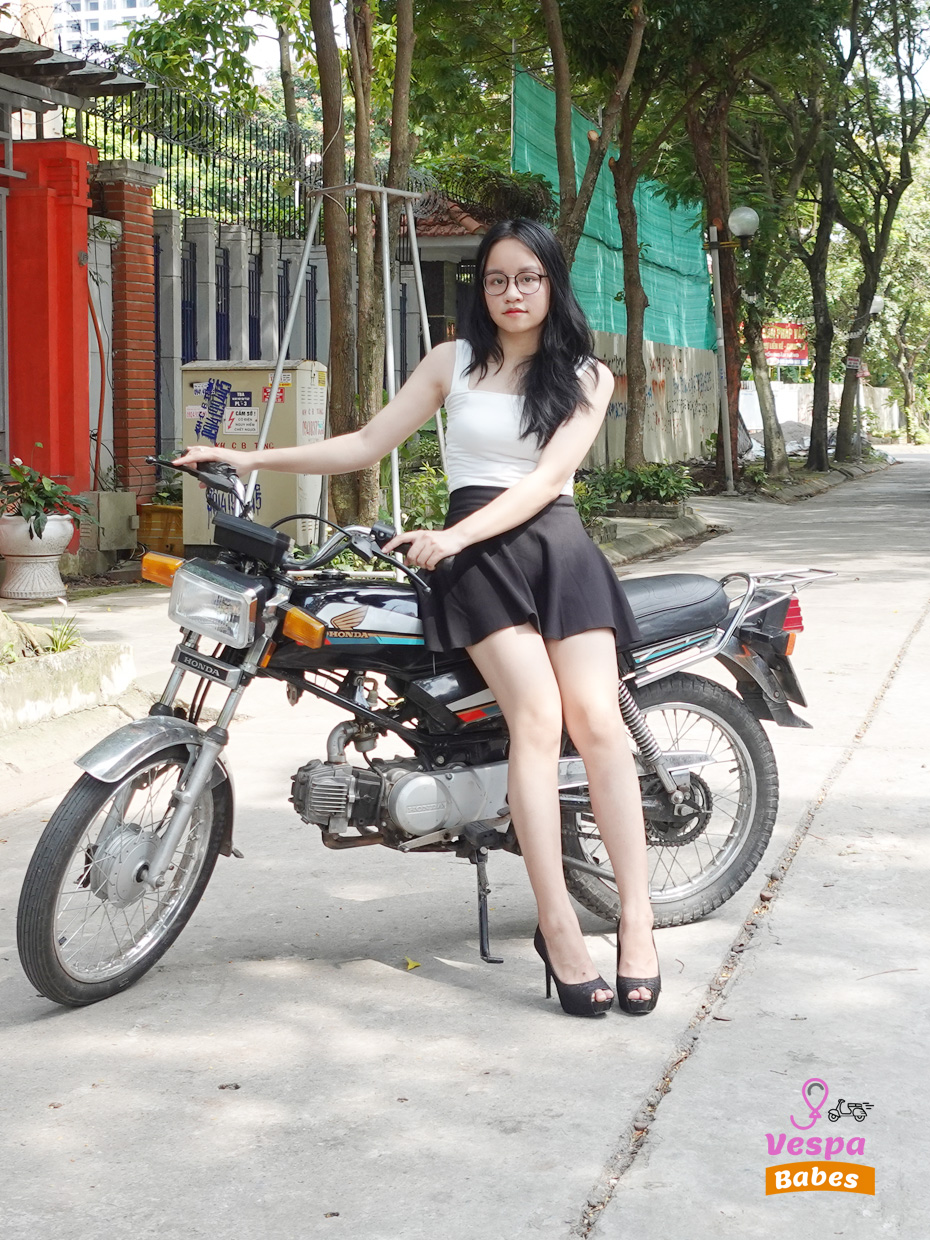 One sunny day she took her motorcycle out to start, She already has a lot of high heels, she wears them to try on, but her feet are still the best with the heels she just bought. She used those heel