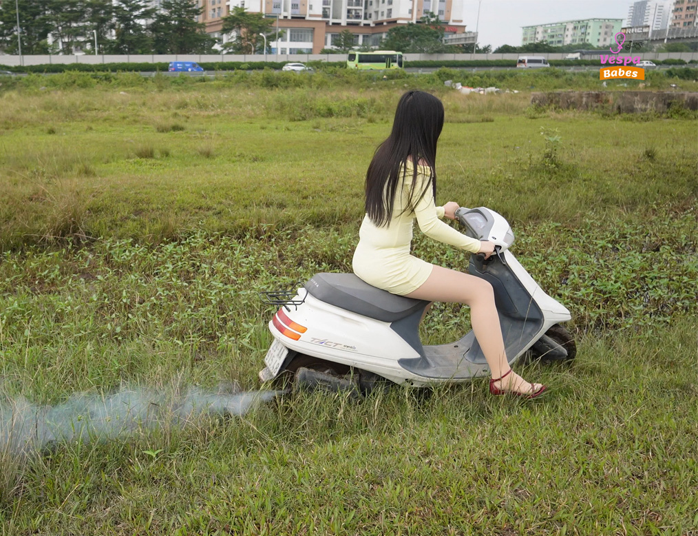 I took her to a wide green grass field so she could freely play with the scooter. But things got chaotic fast — her Honda Tact fell right into a dirt hole and she got completely stuck. Her confused, funny reactions make this moment both adorable and entertaining.